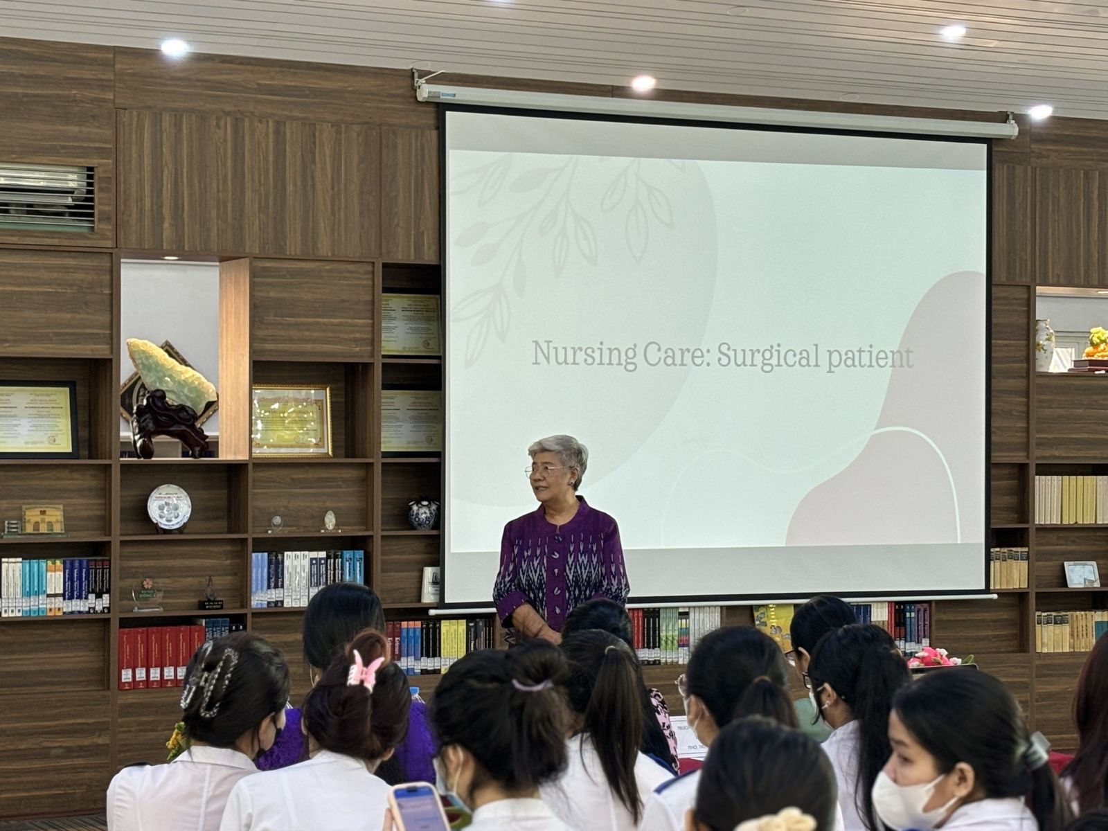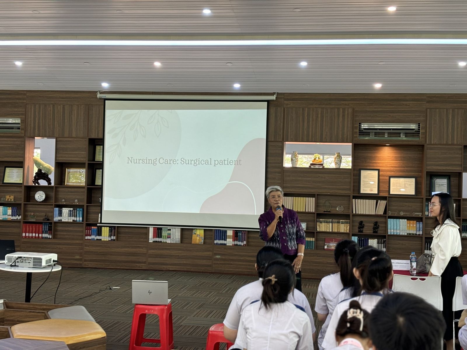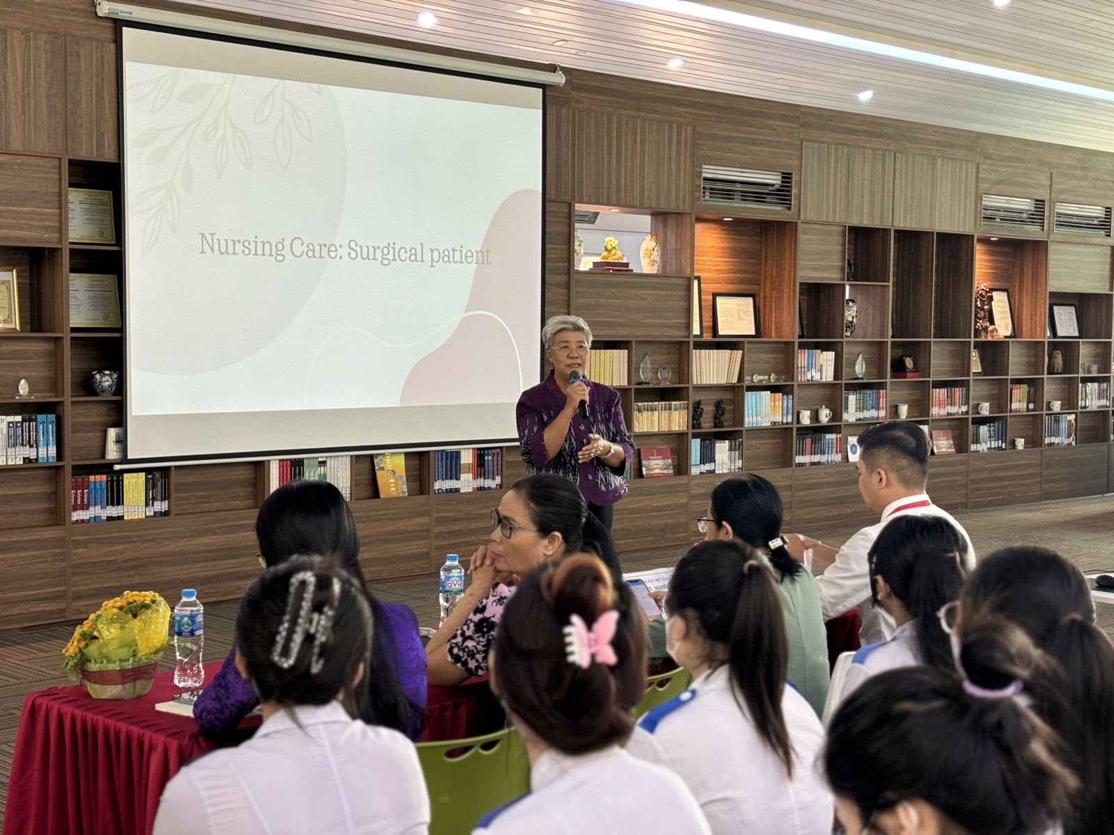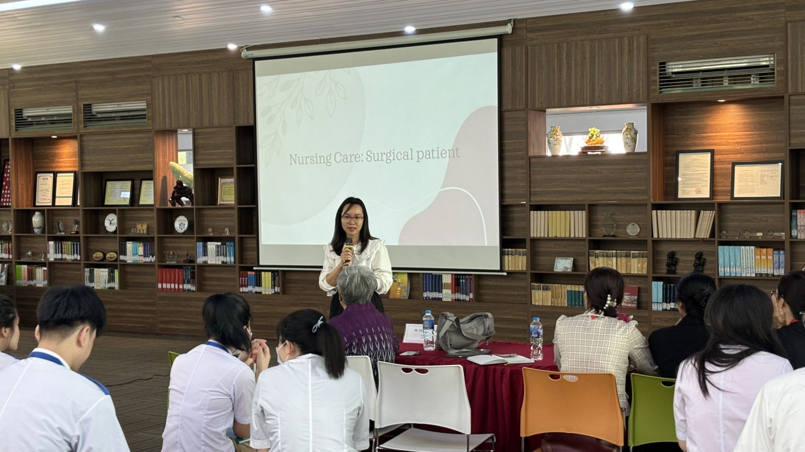 Trong phần mở đầu, Tiến sĩ Panta Apiruknapanond đã giới thiệu tổng quan về các xu hướng mới nhất trong chăm sóc sức khỏe bệnh ngoại khoa, nhấn mạnh vai trò của các kỹ thuật phẫu thuật tiên tiến và những cải tiến trong chăm sóc hậu phẫu. Bà đã chia sẻ những nghiên cứu gần đây về các phương pháp phẫu thuật ít xâm lấn và những lợi ích to lớn mà chúng mang lại cho bệnh nhân. Những tình huống giả định được đưa ra giúp sinh viên rèn luyện kỹ năng xử lý tình huống, quản lý bệnh nhân và thực hiện các kỹ thuật chăm sóc chuyên sâu. Tiến sĩ Panta Apiruknapanond đã tận tình giải đáp mọi thắc mắc và đưa ra những lời khuyên quý báu giúp sinh viên nâng cao kỹ năng thực hành.