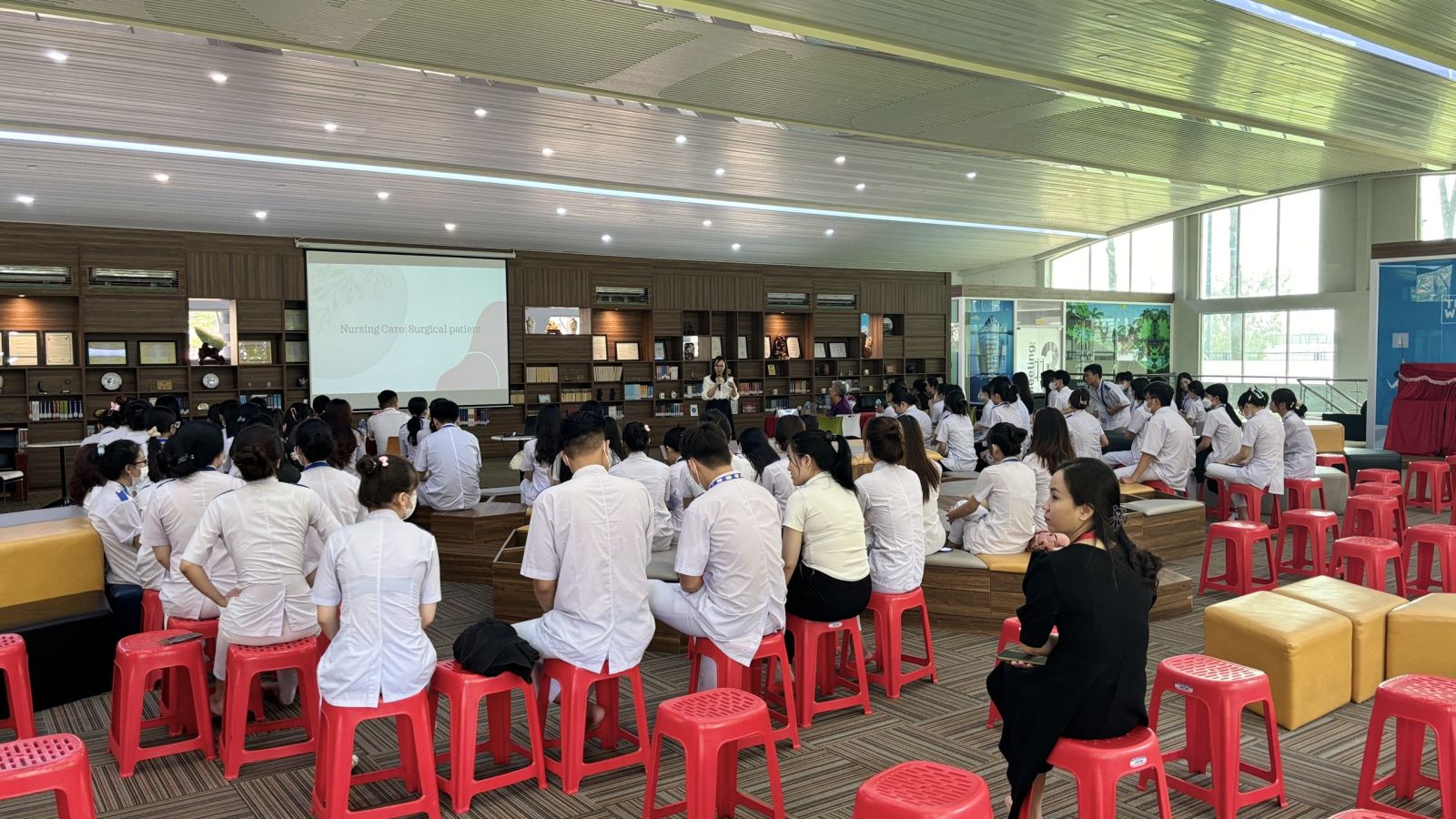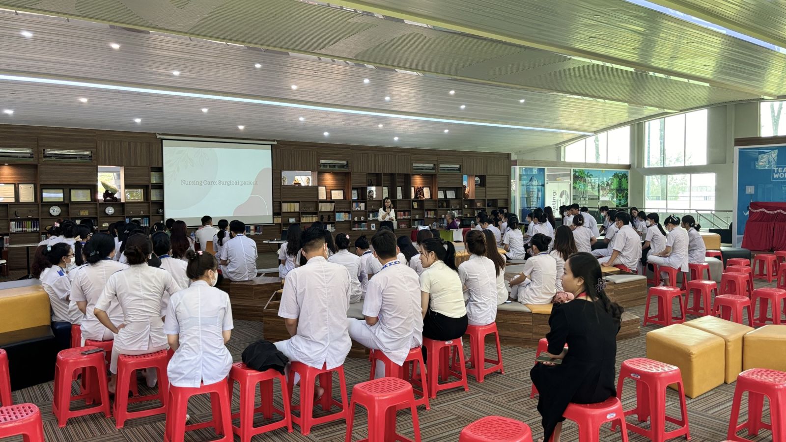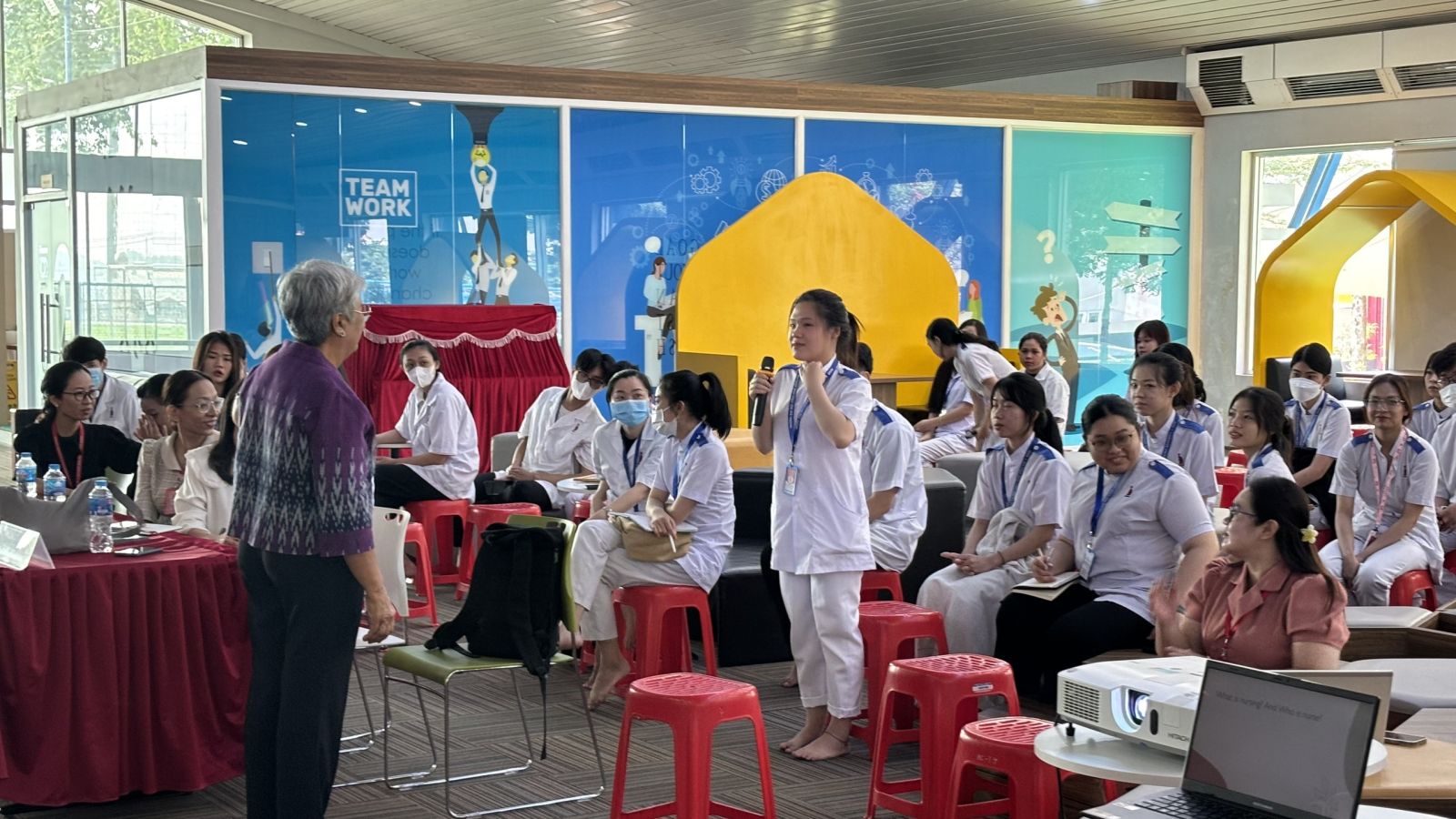Trong phần mở đầu, Tiến sĩ Panta Apiruknapanond đã giới thiệu tổng quan về các xu hướng mới nhất trong chăm sóc sức khỏe bệnh ngoại khoa, nhấn mạnh vai trò của các kỹ thuật phẫu thuật tiên tiến và những cải tiến trong chăm sóc hậu phẫu. Bà đã chia sẻ những nghiên cứu gần đây về các phương pháp phẫu thuật ít xâm lấn và những lợi ích to lớn mà chúng mang lại cho bệnh nhân. Những tình huống giả định được đưa ra giúp sinh viên rèn luyện kỹ năng xử lý tình huống, quản lý bệnh nhân và thực hiện các kỹ thuật chăm sóc chuyên sâu. Tiến sĩ Panta Apiruknapanond đã tận tình giải đáp mọi thắc mắc và đưa ra những lời khuyên quý báu giúp sinh viên nâng cao kỹ năng thực hành.