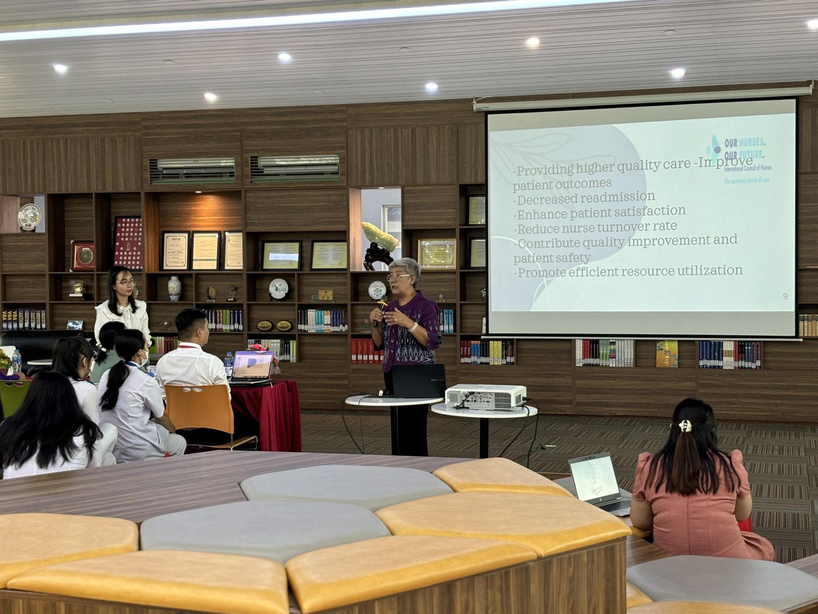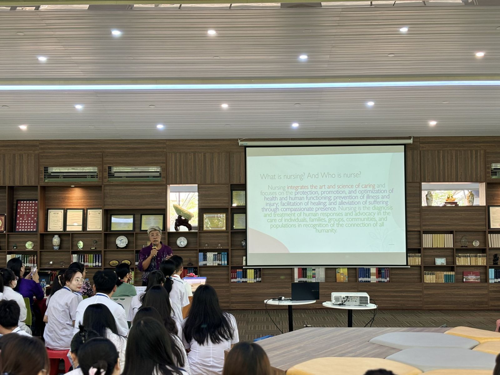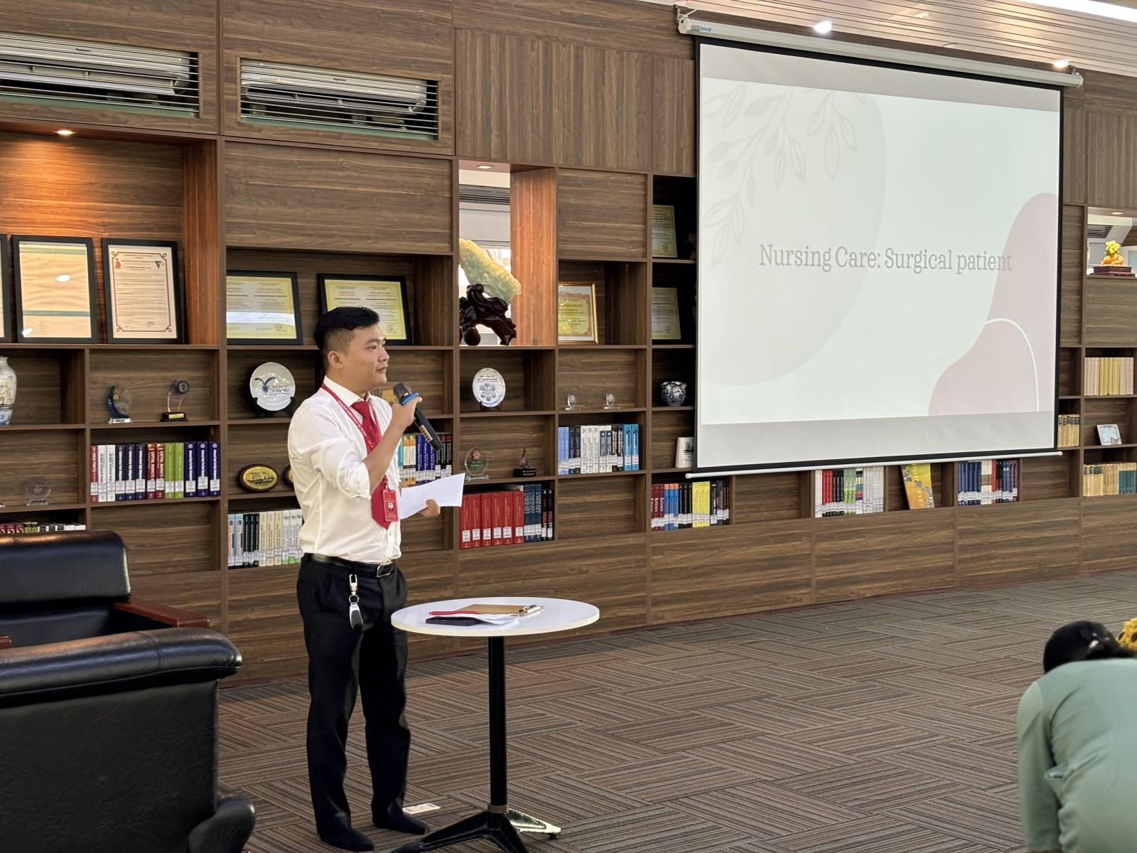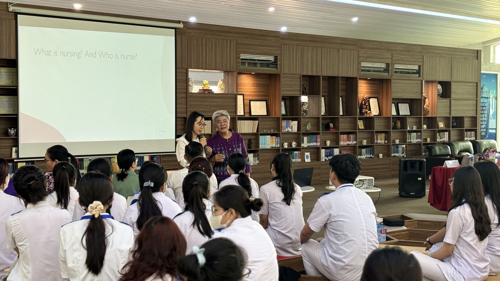 Trong phần mở đầu, Tiến sĩ Panta Apiruknapanond đã giới thiệu tổng quan về các xu hướng mới nhất trong chăm sóc sức khỏe bệnh ngoại khoa, nhấn mạnh vai trò của các kỹ thuật phẫu thuật tiên tiến và những cải tiến trong chăm sóc hậu phẫu. Bà đã chia sẻ những nghiên cứu gần đây về các phương pháp phẫu thuật ít xâm lấn và những lợi ích to lớn mà chúng mang lại cho bệnh nhân. Những tình huống giả định được đưa ra giúp sinh viên rèn luyện kỹ năng xử lý tình huống, quản lý bệnh nhân và thực hiện các kỹ thuật chăm sóc chuyên sâu. Tiến sĩ Panta Apiruknapanond đã tận tình giải đáp mọi thắc mắc và đưa ra những lời khuyên quý báu giúp sinh viên nâng cao kỹ năng thực hành.