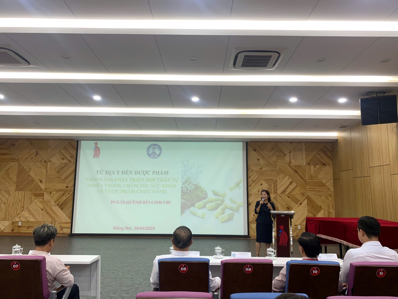 Chủ đề "Từ địa y đến dược phẩm – Tiềm năng phát triển hợp chất tự nhiên trong chăm sóc sức khỏe và thực phẩm chức năng" được trình bày bởi PGS.TS.GVCC. Huỳnh Bùi Linh Chi (Trưởng phòng Đào tạo, Đại học Đồng Nai). Chủ đề thu hút sự quan tâm lớn từ đại biểu tham dự với báo cáo xoay quanh việc khai thác ng ồn hợp chất quý giá từ địa y. Đây là một hướng đi đầy triển vọng trong việc khai thác các nguồn nguyên liệu tự nhiên, góp phần tạo nên những sản phẩm an toàn, hiệu quả và bền vững cho cộng đồng.