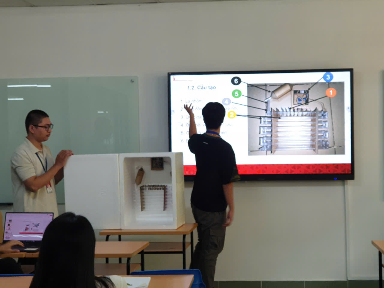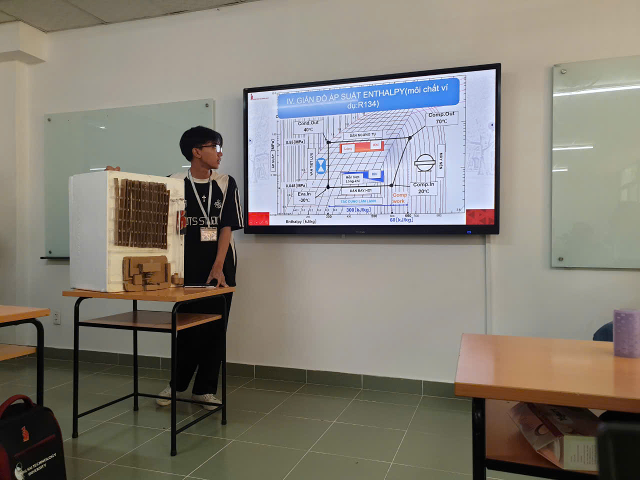 Buổi học học phần “Kỹ thuật lạnh” do thầy ThS. Trần Văn Khánh giảng dạy là một minh chứng. Không khí lớp học trở nên sôi nổi khi các sinh viên lần lượt báo cáo sản phẩm của mình. Các nhóm sinh viên đã trình bày mô hình tủ lạnh bảo quản thực phẩm đầy sáng tạo, được chế tác hoàn toàn từ vật liệu giấy. Dù chỉ là mô hình đơn giản, nhưng qua đó, sinh viên đã vận dụng kiến thức lý thuyết về nguyên lý làm lạnh và bảo quản thực phẩm một cách khéo léo. Thầy Trần Văn Khánh không những đánh giá cao tính sáng tạo của các mô hình mà còn khuyến khích sinh viên tiếp tục tư duy và phát triển các dự án thực tiễn liên quan đến ngành Kỹ thuật lạnh, giúp ứng dụng vào cuộc sống hàng ngày.