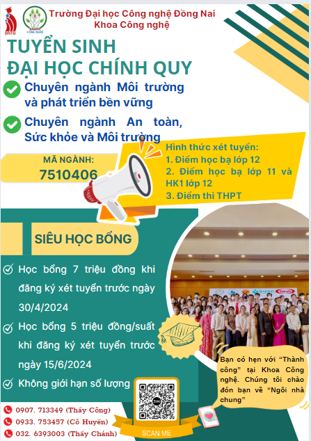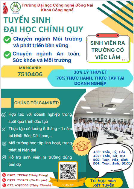 Với định hướng giúp sinh viên rèn luyện, thực hành ngay từ khi còn ngồi trên ghế nhà trường để có thể bắt tay vào làm việc ngay khi tốt nghiệp, sinh viên ngành Công nghệ Kỹ thuật Môi trường tại Đại học Công nghệ Đồng Nai không chỉ được đào tạo bởi đội ngũ giảng viên giàu kinh nghiệm mà còn trực tiếp tham gia vào thực hiện các đề tài NCKH về môi trường. Bên cạnh đó, với sự gắn kết giữa Khoa và các doanh nghiệp, các bạn sinh viên sẽ có nhiều cơ hội thực tập tại các doanh nghiệp từ lúc còn đang đi học, đồng thời được đảm bảo vị trí việc làm sau khi ra trường. Đăng ký ngay hôm nay để nhận được các ưu đãi học bổng từ Khoa và nhà trường nhé!