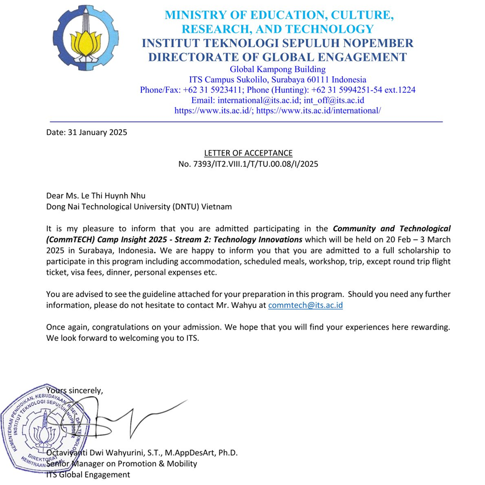 Thư chấp nhận từ Học viện Công nghệ Sepuluh Nopember (ITS), Indonersia.
