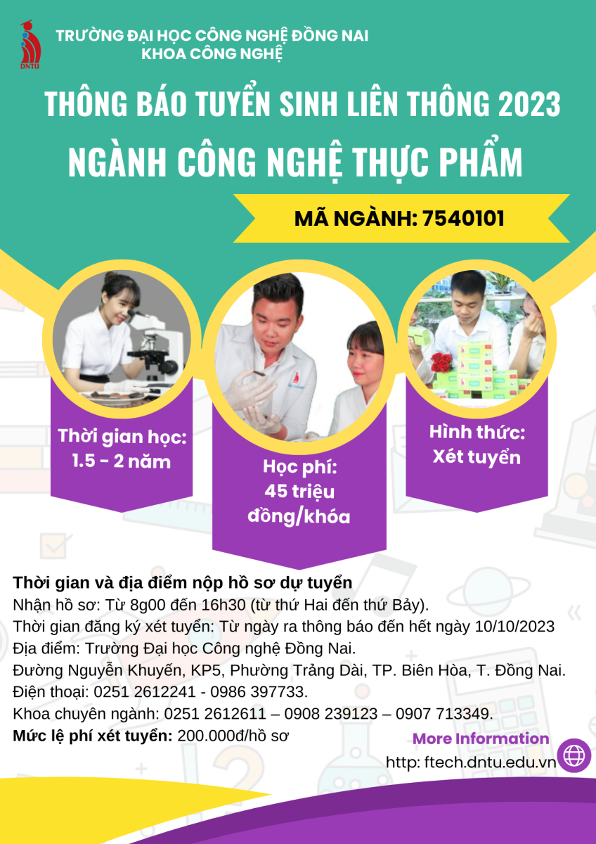 09:45 - 26-09-2023 4 THÔNG BÁO TUYỂN SINH LIÊN THÔNG NGÀNH CÔNG NGHỆ THỰC PHẨM 2023 Xem thêm thông tin chi tiết: Tại đây Tải Đơn đăng kí học: Link tải đơn